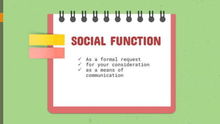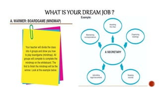 This document provides a lesson handout for students on writing an application letter. It begins by stating the learning objectives, which are to identify the social function, text structure, and language features of an application letter. It then asks students what their dream job is and provides examples of job vacancies. The document explains the three steps to applying for a job: application letter, resume/CV, and appendices. It provides vocabularies and expressions commonly used in application letters. Examples of application letter text structure and components of a resume/CV are also presented. In the end, students are divided into groups and assigned reflection questions and activities to complete involving finding a job vacancy, analyzing example application letters, and writing their own application letter