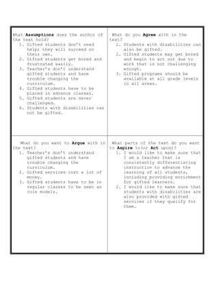 The document discusses assumptions, agreements, arguments, and aspirations regarding gifted students and their education. It agrees that students with disabilities can also be gifted and that gifted programs should be available at all grade levels. It wants to argue that teachers don't always understand gifted students or modify curricula for them, and that gifted services are costly. It aspires to differentiate instruction to advance all learners, including providing enrichment for gifted students, and ensure students with disabilities receive gifted services if eligible.