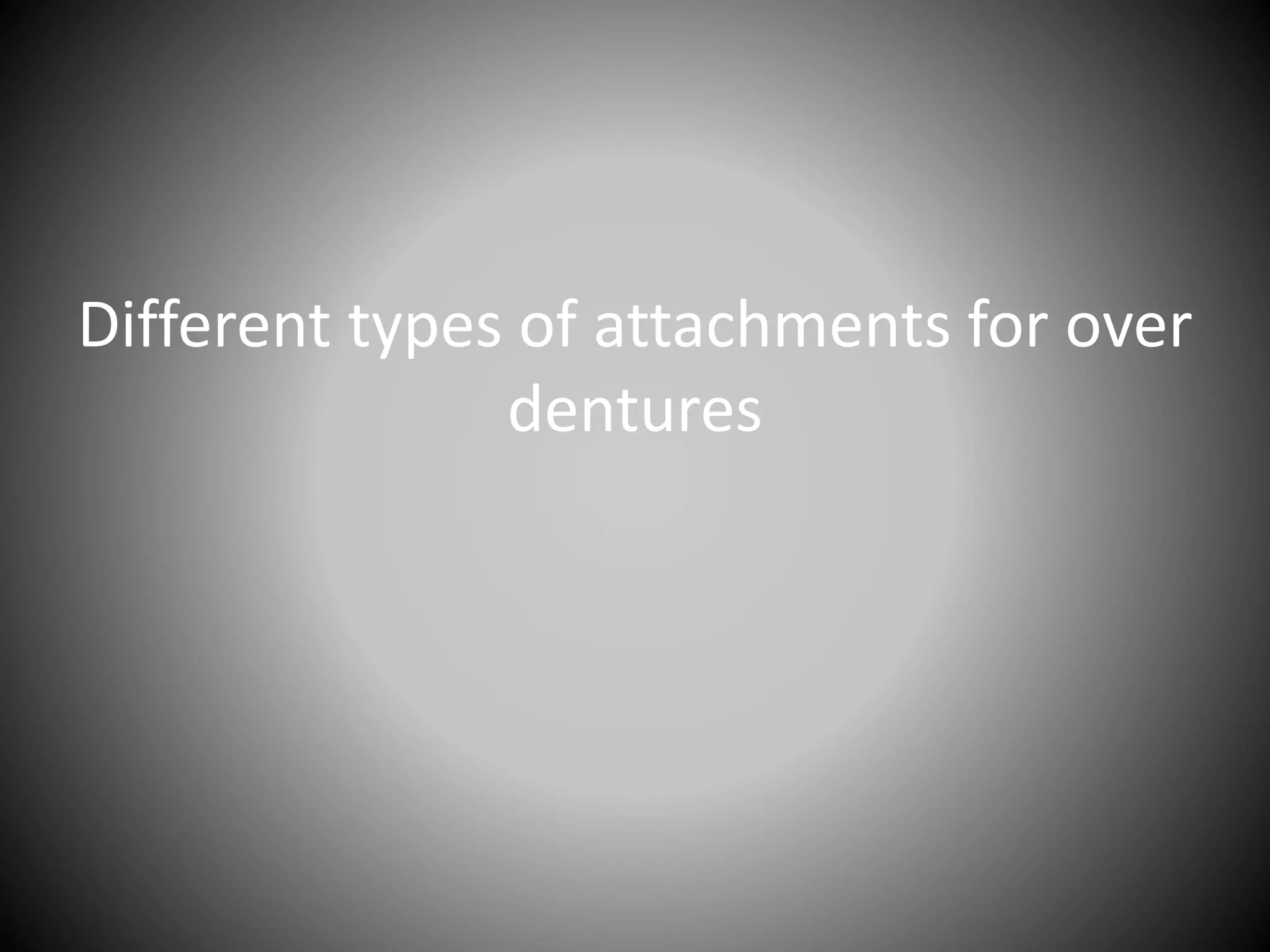The document discusses different types of attachments that can be used for overdentures, including stud attachments, gerber attachments, dalbo attachments, ceka attachments, quinlivan attachments, magnets, bar attachments like hader bars and dolder bars, and gold copings and telescopic crowns. It also mentions maxillary and mandibular implant supported overdentures and lists some references for further information.