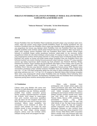 Kajian ini meneliti peranan pendidikan Islam dan moral dalam membina sahsiah pelajar berkualiti di politeknik, dengan menekankan pentingnya pemahaman kurikulum dan aplikasi nilai-nilai dalam kehidupan seharian. Dapatan menunjukkan pemahaman yang tinggi terhadap kurikulum, tetapi pelaksanaan akhlak dalam kehidupan pelajar berada pada tahap sederhana, dengan faktor keluarga sebagai pengaruh utama. Objektif kajian termasuk mengenalpasti pemahaman kurikulum dan faktor yang mempengaruhi sahsiah pelajar.