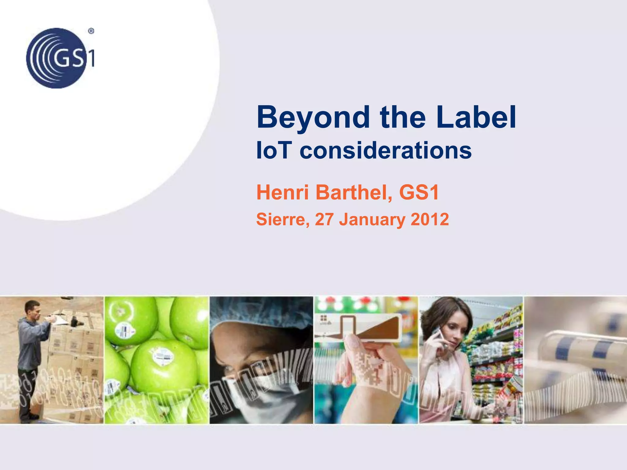 This document discusses considerations for the Internet of Things (IoT). It provides background on the origins of the term IoT and GS1's work related to IoT standards. Specifically, it describes GS1's role in a European Union-funded project called GRIFS from 2008-2009 to document global RFID standards activities and establish an IoT standards forum. The document encourages attendees to visit the IoT standards website that GS1 maintains as a resource for information on IoT standards developments. It closes by thanking the audience for their attention.