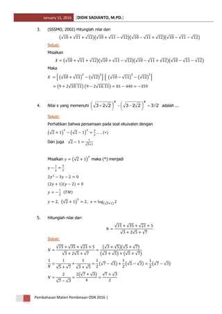 Dokumen ini membahas materi pembinaan Olimpiade Sains Nasional (OSN) 2016, berfokus pada soal-soal matematika yang melibatkan bentuk akar. Terdapat penjelasan dan solusi untuk berbagai tipe soal, seperti racikan penyederhanaan dan penghitungan nilai dari ekspresi matematika. Ringkasan ini mencakup contoh soal dan langkah penyelesaian yang jelas.