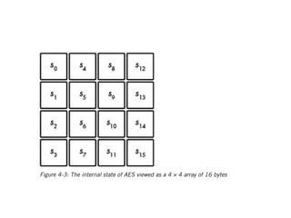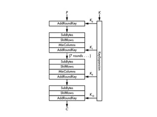 Block ciphers like AES encrypt data in fixed-size blocks and use cryptographic keys and rounds of processing to encrypt the data securely. AES is the current standard, using 128-bit blocks and keys of 128, 192, or 256 bits. Modes of operation like ECB, CBC, CTR are used to handle full messages. ECB is insecure as identical plaintext blocks produce identical ciphertext, while CBC and CTR provide security if nonces and IVs are not reused. Implementation details like padding and side channels must be handled carefully to prevent attacks.