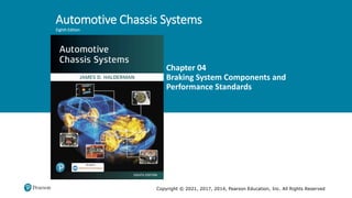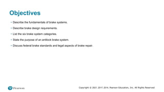The document discusses the fundamentals of brake systems, emphasizing their critical role in vehicle safety through converting motion into heat to stop wheels. It categorizes brake system components into six subsystems, explains the function of antilock brake systems (ABS), and outlines federal safety standards for brake performance established by the U.S. Department of Transportation. Additionally, it highlights the responsibility of vehicle owners and technicians in maintaining effective braking performance post-manufacture.
