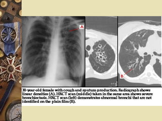 Differential diagnosis Differentiate from: Chronic bronchitis No recurrent hemoptysis; CT scan  Lung abscess X-ray/CT: local infiltrated shadow or cavitations with air-fluid level inside.