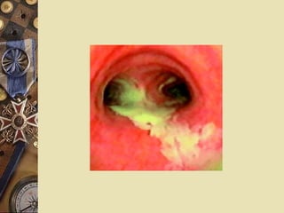 Clinical presentation 2. Chronic cough 3. Hemoptysis: Frequent More commonly in dry variety Usually mild (blood streaking of purulent sputum) Massive hemoptysis is usually from dilated bronchial arteries or bronchial-pulmonary anastomoses under systemic pressure   4. Recurrent pneumonia: same segment 5. Systemic manifestations: fever, weight loss