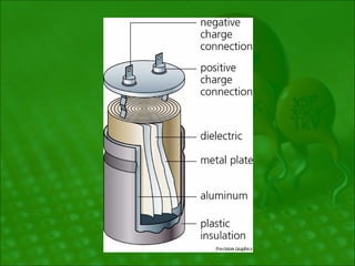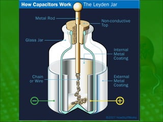 The document provides a brief history of capacitors, describing their invention by Ewald Georg von Kleist in 1745, Pieter van Musschenbroek's Leyden Jar in the same year, and Benjamin Franklin's experiments with storing charge. It explains that a capacitor consists of two conductors charged with equal and opposite charges that are separated by an insulator, and that a battery charges the plates by pulling electrons from the positive plate and depositing them on the negative plate. The capacitance of a capacitor depends on the area of the plates, distance between plates, and dielectric constant of the insulating material.