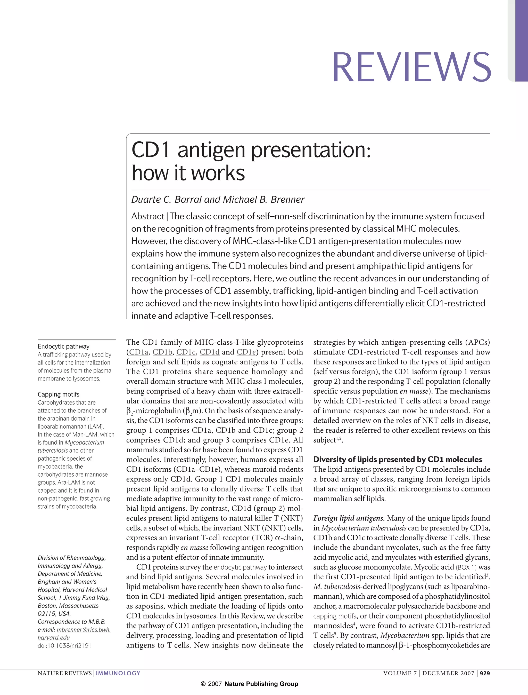 CD1 antigen presentation involves CD1 molecules binding and presenting lipid antigens to T cells. CD1 molecules are similar to MHC class I and present both foreign and self lipids. They assemble in the endocytic pathway and bind diverse lipid antigens, including those unique to microbes as well as common mammalian lipids. CD1 molecules present lipids to both adaptive immune cells and innate immune cells like NKT cells. This allows the immune system to recognize the abundant universe of lipid antigens and mount appropriate responses.