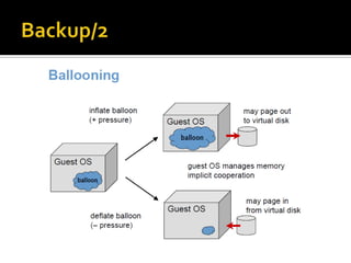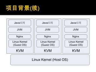 该文档讨论了朱延海在2012年关于主站现状的项目背景,包括虚拟化技术的选择及其实现。文中介绍了cgroup和Linux容器的概念、优缺点以及如何在虚拟机中动态管理资源。最后分析了在资源紧张时的内存管理策略和相关技术挑战。