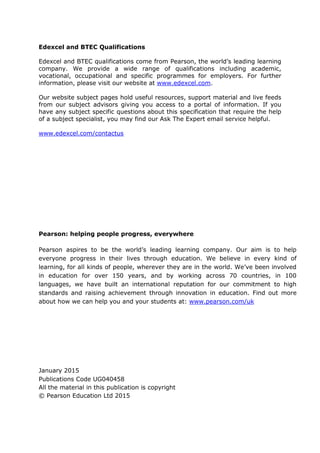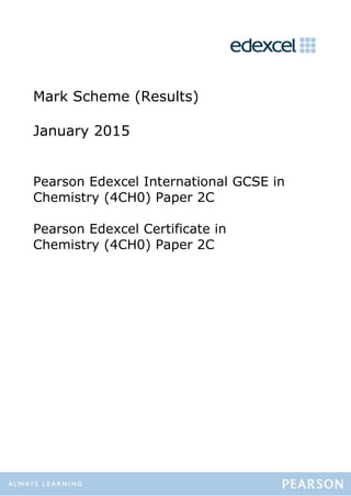 This document provides the mark scheme and guidance for grading Pearson Edexcel's International GCSE in Chemistry exam from January 2015. It outlines the general marking guidelines instructing examiners to mark candidates positively and award all marks described in the scheme. It also contains sample exam questions and answers describing the expected responses and marks allocated.