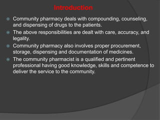 The document outlines the essential roles and responsibilities of community pharmacists, emphasizing the importance of proper drug dispensing, patient counseling, and adherence to legal requirements. It details various types of drug store designs, licensing requirements, and the necessary documents for opening retail or wholesale drug stores. Additionally, it covers best practices for drug storage and maintenance, highlighting the need for organized record-keeping in pharmacy operations.