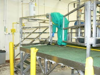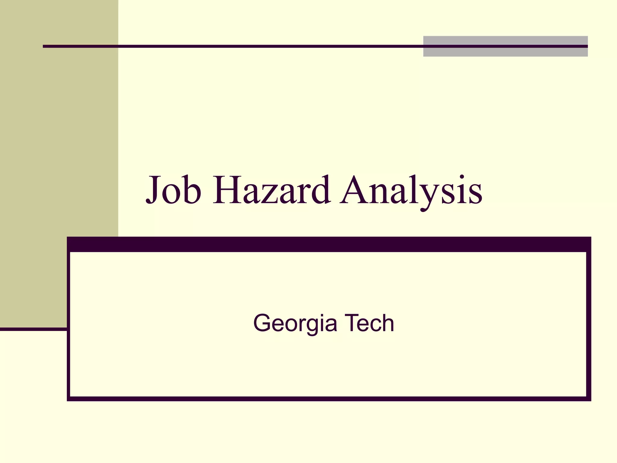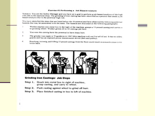 This document discusses techniques for identifying workplace hazards, including job hazard analysis (JHA). It provides an example JHA for exotic plant removal. The JHA identifies hazards at each step, like environmental exposure and ergonomic strains, and recommends controls like proper personal protective equipment and lifting techniques. The document emphasizes involving employees and using a team approach to thoroughly identify hazards and appropriate controls.