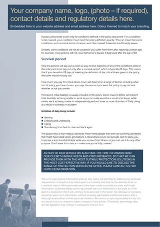 The document discusses critical illness cover, which provides a tax-free lump sum if diagnosed with a critical illness. It covers illnesses like cancer, heart attack, stroke, and loss of limbs or senses. Critical illness cover can help pay off a mortgage or provide financial support during illness. The policy specifics which illnesses are covered and may have age limits or survival periods before payout. It recommends seeking advice to choose the right critical illness policy tailored to individual needs and circumstances.