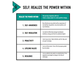 This document presents an "EL Journey Wheel" which is a tool used to help define concepts like proactivity and responsibility, and apply them to different scenarios. It does this using concentric circles to distinguish between factors that are within and outside of one's control ("Circle of Influence" and "Circle of Concern"). Several examples are given applying this framework to situations like traffic laws, school reputation, time management, and conflict resolution. The document emphasizes taking personal responsibility and initiative to address issues within one's influence, rather than focusing on external factors outside of control. Effective time management is identified as key to exercising proactivity and influence over one's circumstances.