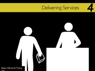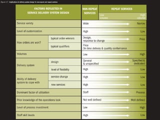 The document discusses factors that affect service delivery system design. It covers characteristics of services, categories of services, designing service delivery systems, and using front and back office functions. Some key points include: