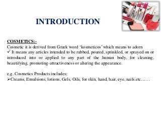 This document provides an overview of different types of cosmetic products and their formulations. It discusses 11 main categories of cosmetics: 1) face powders, 2) compact face powders, 3) rouges, 4) cold creams, 5) cleansing creams, 6) vanishing creams, 7) moisturizing creams, 8) foundation creams, 9) eye makeup preparations (eye shadows, eyebrow pencils, mascara), 10) lipsticks, and 11) bleaches. For each category, it describes their purpose and provides example formulations consisting of common ingredients used in their preparation. The document also discusses various ways cosmetics can be classified, such as by use
