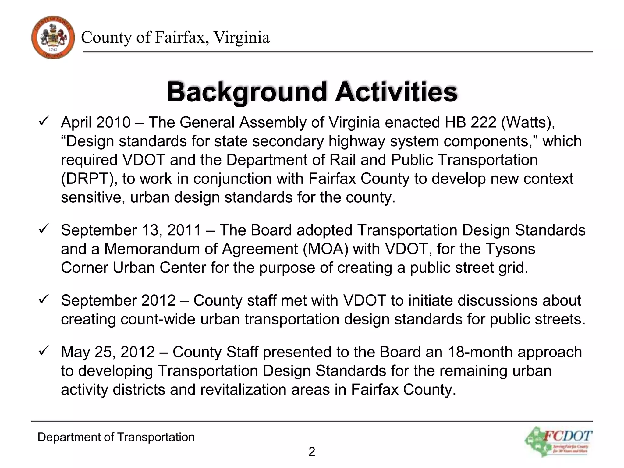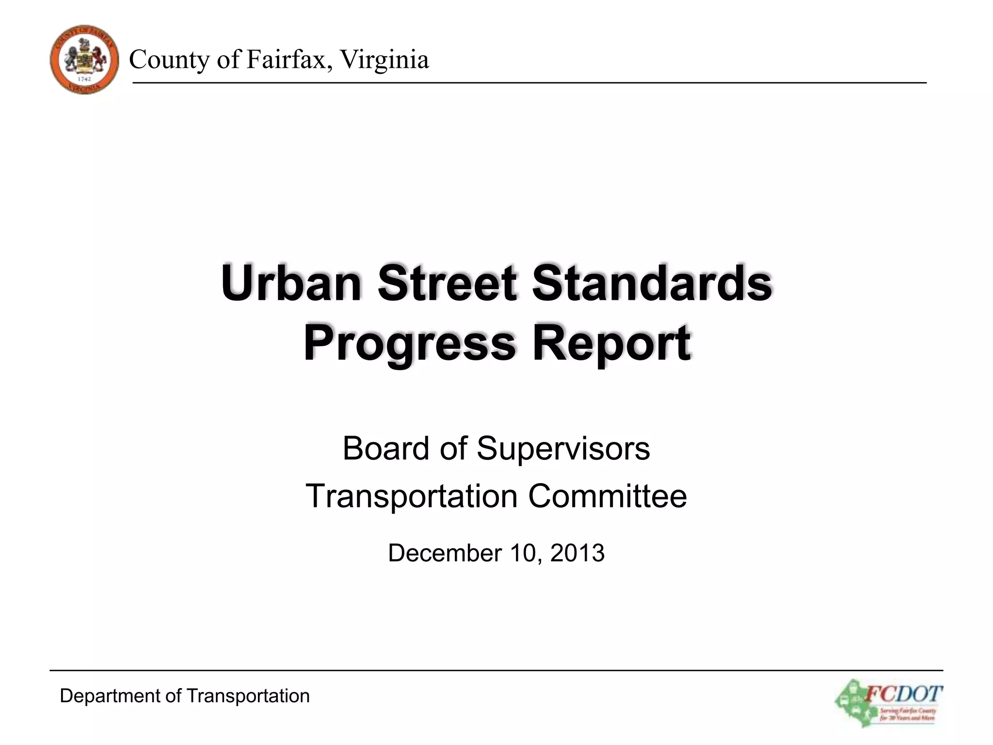 The document provides a progress report on developing urban street standards for Fairfax County, Virginia. It summarizes background activities including developing design standards for Tysons Corner and initiating discussions on county-wide standards. It outlines the development of multimodal maps for Franconia-Springfield and presents a schedule to develop maps for 11 additional activity districts by August 2014. It discusses remaining tasks such as developing road cross sections, updating plans and standards, and implementing the new design standards.