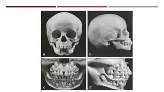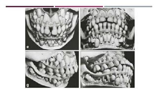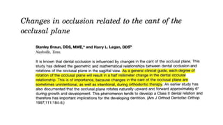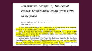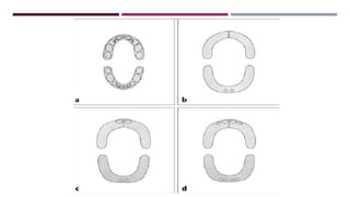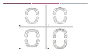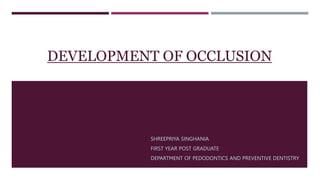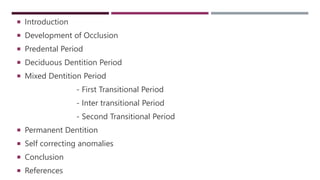 This document discusses the development of occlusion from birth through the primary and mixed dentition periods. It describes the key stages and changes that occur during predental, deciduous dentition, and mixed dentition periods. During the deciduous dentition period, the primary teeth erupt in a spaced arrangement to allow for proper alignment of the permanent teeth. The terminal plane between the maxillary and mandibular second primary molars is an important reference point. A modified Angle's classification is also described for assessing occlusion during the primary dentition stage.