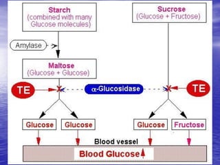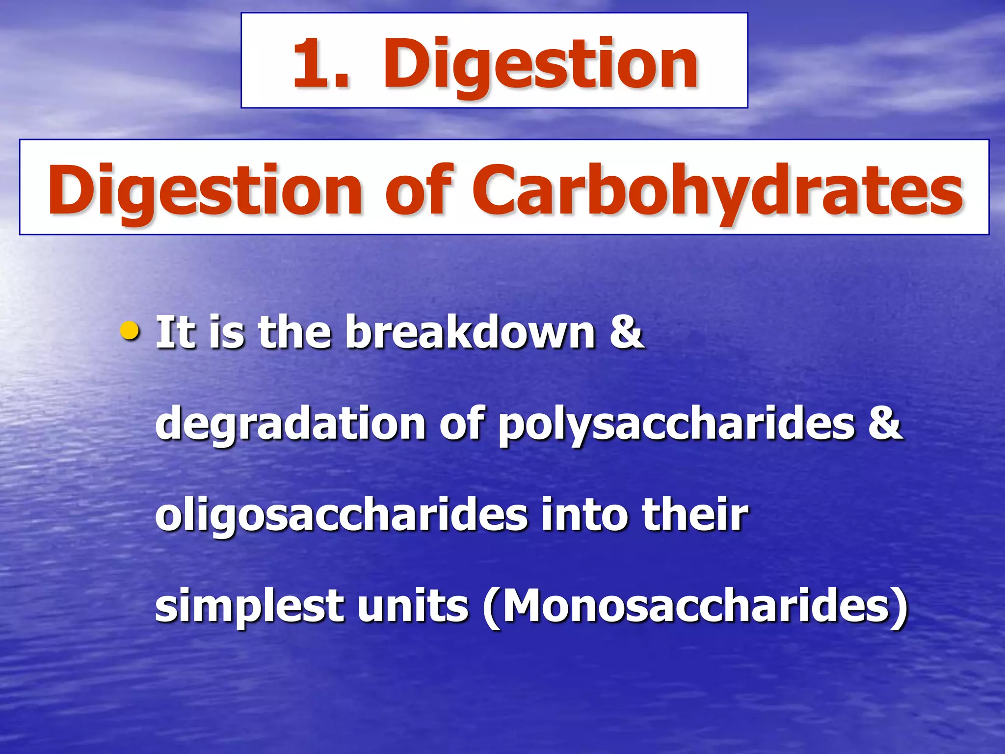 1. Digestion breaks down carbohydrates into monosaccharides like glucose and fructose. Salivary amylase and enzymes in the small intestine like maltase, lactase, and sucrase aid in this process.