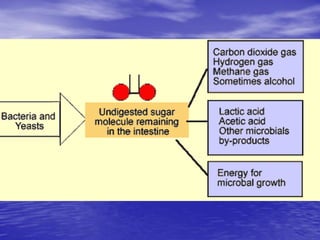 3. Lactose intolerance occurs when lactase enzyme is deficient, causing undigested lactose to pass to the colon and cause gas, bloating, and diarrhea.