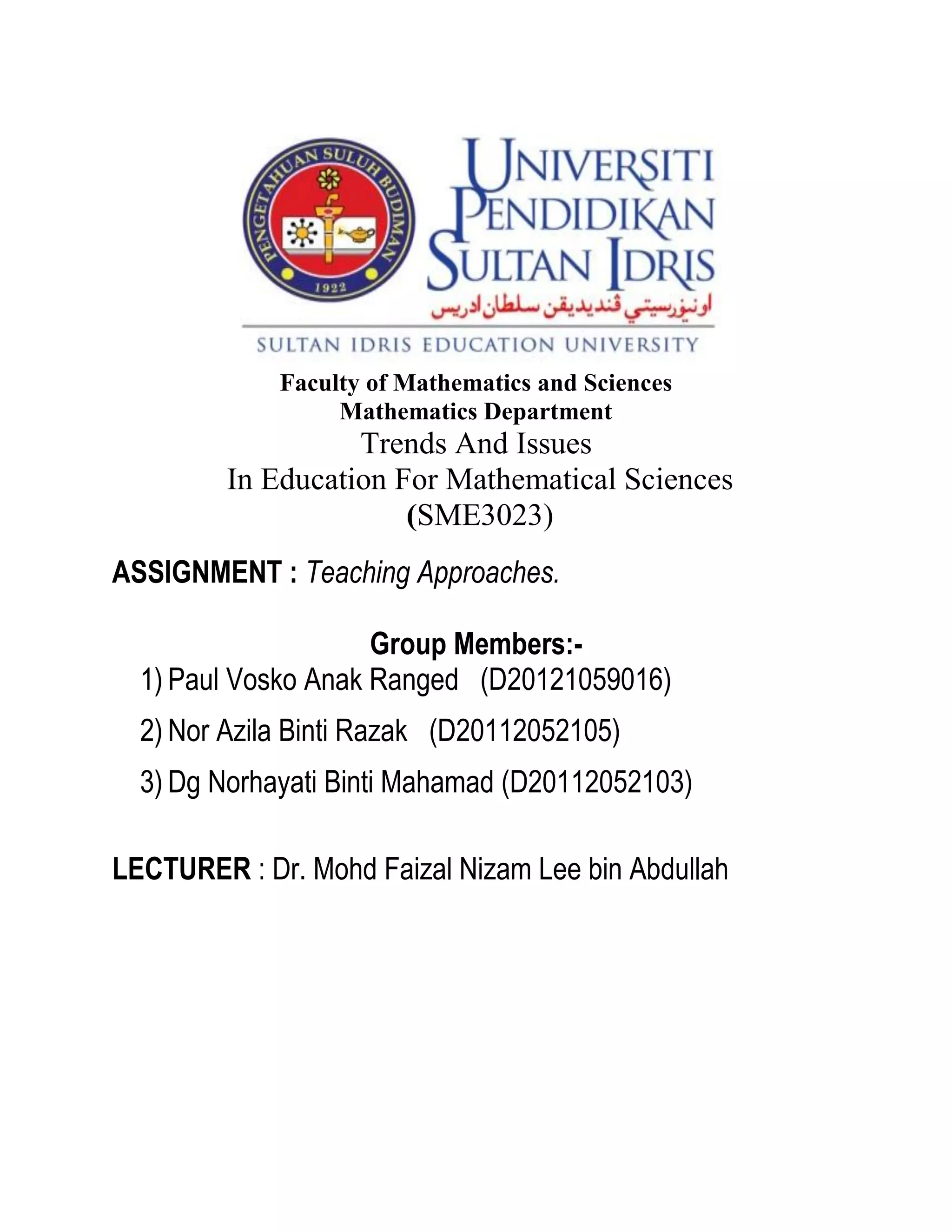This document discusses different teaching approaches used in mathematics education, including cooperative learning, problem-based learning, and case studies. Cooperative learning involves students working in small groups to achieve common goals, emphasizing positive interdependence, interaction, individual accountability, collaborative skills, and group processing. Problem-based learning frames instruction around non-routine problems that require students to discover new knowledge to solve. Case studies present real-world situations for students to analyze and resolve, applying theoretical concepts. These active learning strategies encourage students to directly engage with course content.