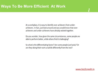 This document provides 4 tips to improve efficiency at work: 1) prioritize tasks according to your routine, 2) avoid negativity and love your work, 3) arrive and leave on time, and 4) stop multitasking and start delegating some tasks. The document aims to help small businesses grow by sharing these hacks to boost efficiency.