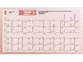 To determine heart rate, it describes the 300 rule where the number of large boxes between beats is divided into 300. It also describes the 10 second rule where the number of beats in 10 seconds is multiplied by 6.