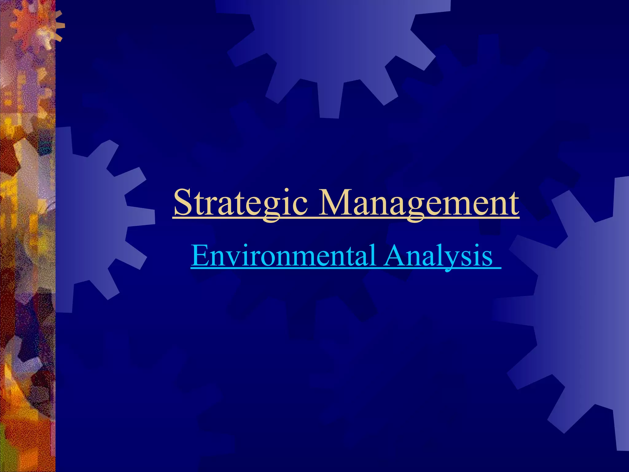 The document discusses analyzing an organization's internal and external environments. It focuses on the macro (external) environment, identifying nine key factors that compose it: 1) economic, 2) technological, 3) legal, 4) labor, 5) socio-cultural/demographic, 6) competitive, 7) ecological, 8) ethical, and 9) corporate social responsibility environments. Understanding these external forces is important as they can pose opportunities and threats to an organization outside of its control. The document provides examples and details about each environmental factor and its potential impact on operations.