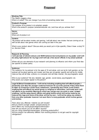 The podcast will be called The Reed'o Baggins Show and will entertain audiences ages 16 and older by discussing upcoming movies and games. It will use vibrant colors, balanced text and images in promotional materials, and light colored logos. Sound effects will be included to engage listeners. While younger audiences cannot be restricted, a disclaimer will warn of mature content. Offense will be avoided through careful consideration of topics. Trailers and sound effects may be used under fair use but the logo and show name will be original creations to avoid copyright issues with other podcasts reviewing similar entertainment industries.