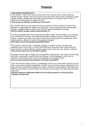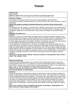 This proposal outlines a fashion brand that aims to make people feel unique through streetwear clothing and accessories. The brand would include a clothing line with logo-based designs inspired by Supreme, All Saints, and other brands. Advertising would include a catalog, poster, app logo, and website to showcase the products. Research was conducted on fonts, color schemes, and styles from existing brands to inform the design elements. The target audience is teenagers and young adults aged 15-25, across genders. Some designs like camo prints or those featuring animals could potentially offend pacifists, animal activists, or vegans. Original designs, names, and logos will be created to avoid copyright issues.