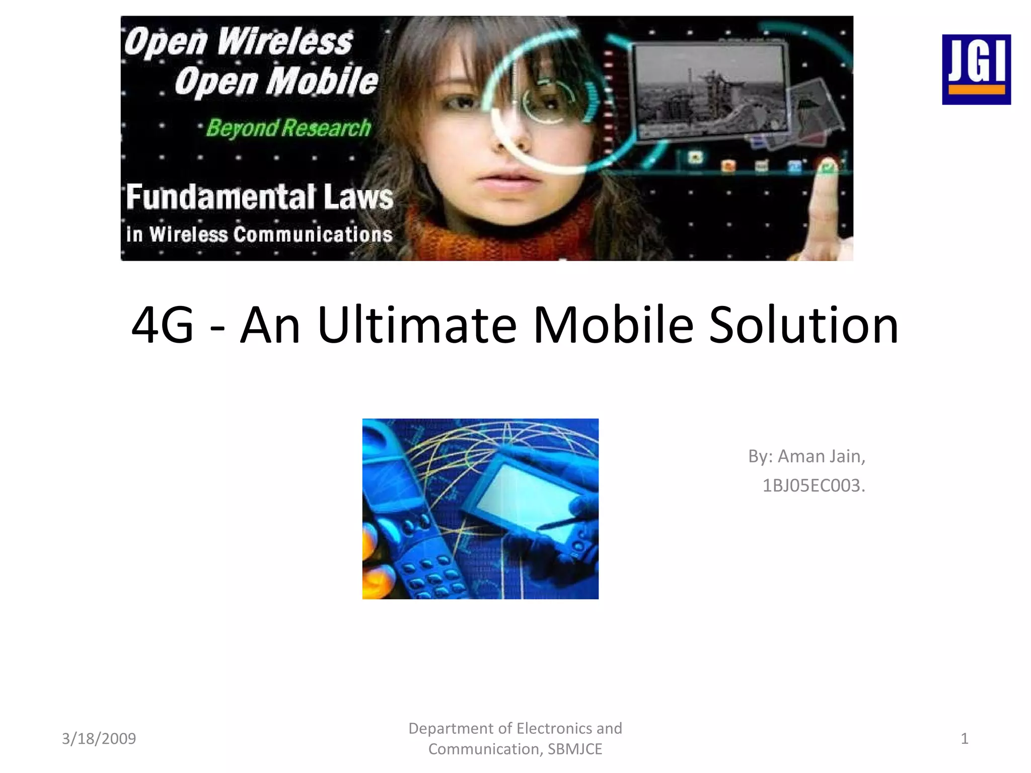 4G refers to the next generation of wireless technology that promises higher data rates and expanded multimedia services. It is defined as a fully IP-based integrated system providing 100 Mbps outdoors and 1 Gbps indoors, with quality of service and security, offering customized personal services anywhere through seamless interoperability using technologies like OFDM, MIMO and IPv6. Research is ongoing to build 4G networks through approaches like lower prices, more spectrum coordination, and standardization while addressing issues like security, lack of standards and wireless spam.