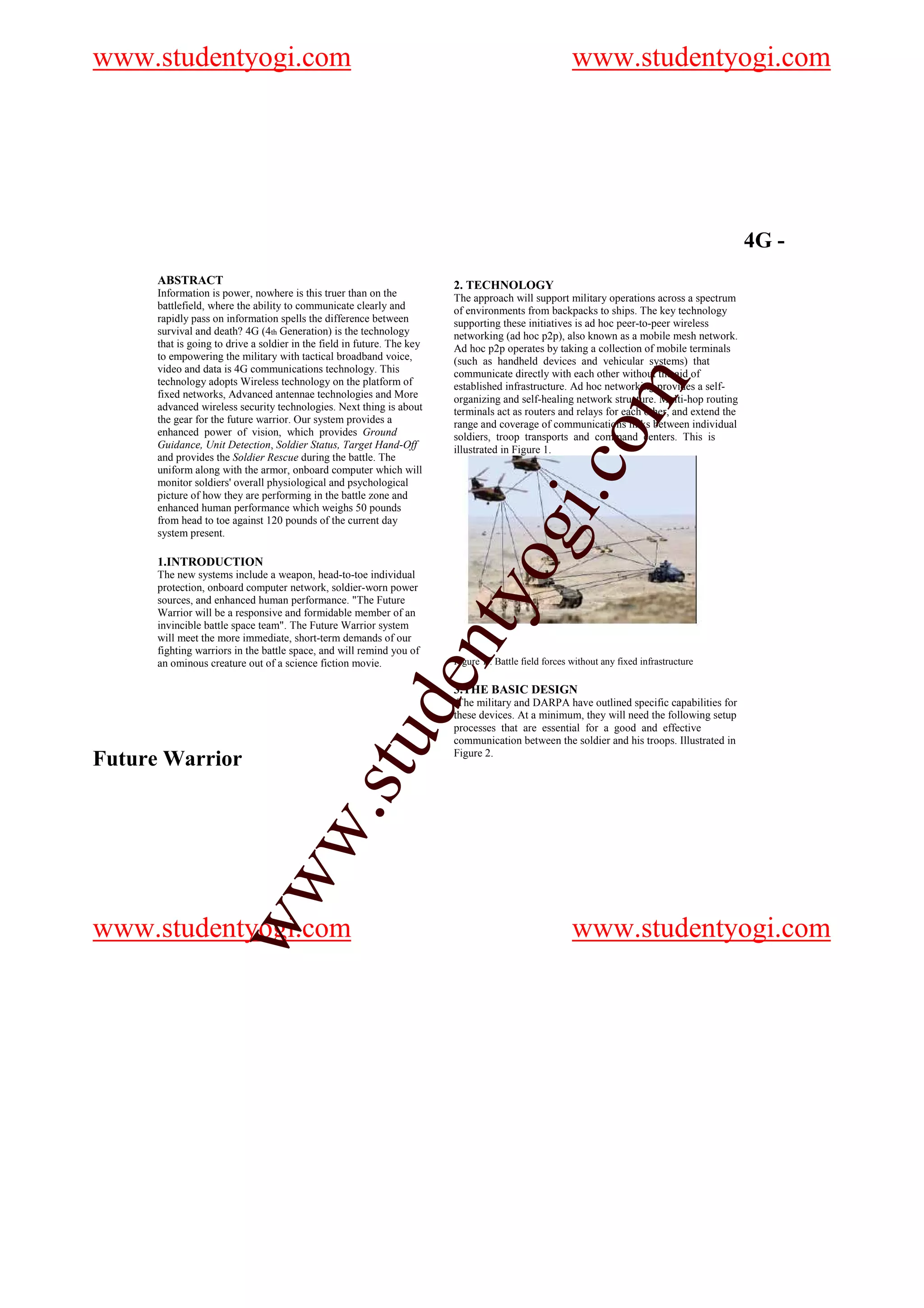 The document discusses the technology needs of future warriors. It describes a system using 4G networks to provide soldiers with enhanced communication, detection, guidance and monitoring abilities. Key features include an ad-hoc peer-to-peer mesh network for communication without fixed infrastructure, geo-location triangulation beyond GPS, security from jamming and capture, and IP networking. The system would provide ground guidance to avoid obstacles, detect and identify units beyond line of sight, transfer targeting data, and monitor soldier status and rescue injured soldiers. It proposes power-assisting exoskeletons and protective nanotechnology uniforms that are lightweight yet strong enough to withstand gunfire. Sensors would allow soldiers to control devices by voice and be monitored for health and