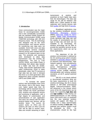 The document discusses the need for 4G technology to provide high data rates, seamless connectivity between networks, and quality of service for multimedia applications. It describes how 4G aims to achieve data rates between 100 Mbps to 1 Gbps for both stationary and mobile devices using technologies like OFDM modulation, MIMO, smart antennas, and an all-IP network. The document outlines the expected evolution from 3G to 4G technologies by 2011 as groups work to achieve the key 4G components and deployment goals.