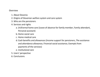 - The Slovenian welfare system originated from the 1950s Yugoslav model and includes both public services (e.g. homes for older adults) and informal family support. Major development of home care services occurred in the last 20 years.