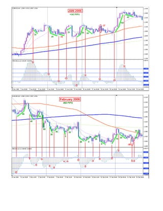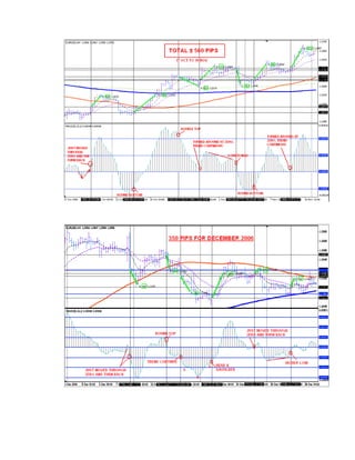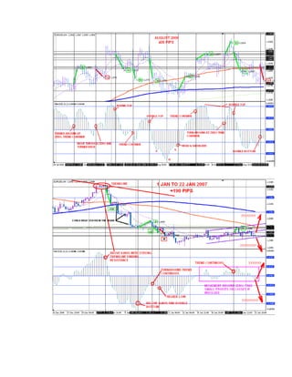 This document introduces a forex trading strategy using the MACD indicator on a 4-hour timeframe. It describes the strategy's focus on simplicity and high probability trades. Figures 1-3 are included to illustrate past trade signals and results, with Figure 1 showing 14 signals over 5 weeks that produced good results. The strategy aims for 95% accuracy by filtering for the best MACD signals. Setup instructions are provided for the MACD settings and moving averages to use on charts. Common MACD patterns that signal high probability trades are explained, such as heads and shoulders and rounding tops and bottoms.