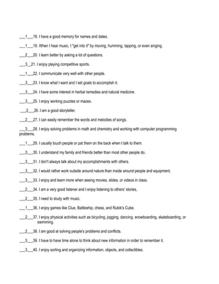 The document is an activity sheet that guides individuals through a self-assessment to identify their dominant intelligence based on Howard Gardner's theory of multiple intelligences. It contains 40 statements to rate on a scale of 1 to 3 and instructions to tally the scores in each intelligence category to determine their top three intelligences.