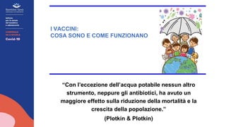 Il documento discute l'importanza dei vaccini nella prevenzione delle malattie, evidenziando come salvino tra i 2 e i 3 milioni di vite ogni anno e contribuendo significativamente all'aspettativa di vita. Spiega il funzionamento del sistema immunitario e come i vaccini attivano una risposta immunitaria specifica, generando memoria immunologica che protegge da future infezioni. Inoltre, analizza le modalità di sviluppo e approvazione dei vaccini, in particolare quelli contro il COVID-19, e il concetto di immunità di gregge per fermare la diffusione delle epidemie.