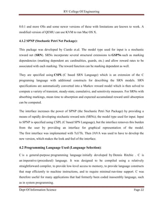 The implementation phase involves materializing ideas from analysis and design into the final solution. The authors implemented rejuvenation on three domains using warm and cold methods based on time and prediction policies. They also simulated rejuvenation of failing nodes and implemented Petri net modeling. KVM was selected as the virtualization platform and run on CentOS. C was used as the programming language and key libraries were included. NFS was configured to enable sharing of VM images between servers to allow live migration.