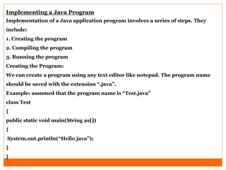 The document outlines the steps for implementing a Java application, which include creating, compiling, and running a Java program. It explains how to save the program in a text editor, compile it using the 'javac' tool, and set the path and classpath environment variables for execution. Finally, it details the commands required to compile and run the program in the command line interface.