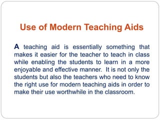 The document outlines four important modern teaching aids: computers, PowerPoint slides and games, interactive electronic whiteboards, and overhead projectors, emphasizing their role in enhancing teaching and learning experiences. It highlights the necessity for both teachers and students to understand their effective use in classrooms. Additionally, it mentions the Asian College of Teachers, an organization focused on high-quality teacher education, with a global presence and diverse enrollment across education levels.