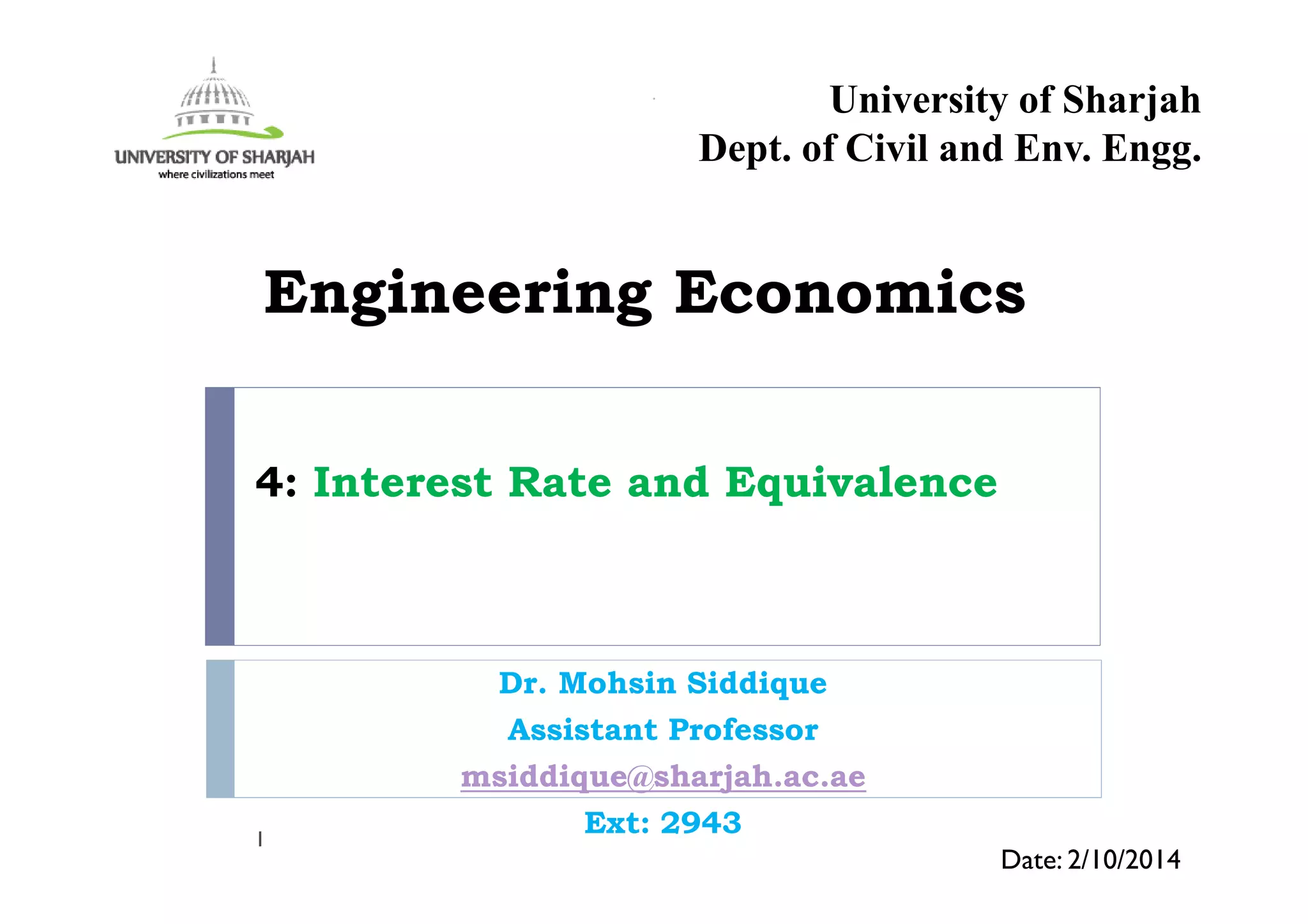 This document discusses interest rates and time value of money concepts. It begins by defining simple and compound interest rates. Examples are provided to illustrate calculating interest and total amounts due using simple and compound interest formulas. The concept of economic equivalence is introduced, showing that different cash flows can be equivalent based on a common interest rate. The single payment compound interest formula is derived and used to solve examples of determining future or present values. Overall, the document provides an introduction to fundamental time value of money and interest rate concepts in engineering economics.