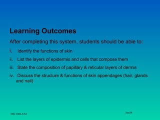This document provides an overview of the integumentary system, which consists of the skin and its accessory structures like hair, glands and nails. It describes the structure and layers of the skin, including the epidermis and dermis. It details the functions of skin like protection, sensation, regulation and secretion. It discusses the cells and layers that make up the epidermis, as well as the structures in the dermis. The document also reviews skin appendages such as hair, nails and glands, and describes wound healing and scar formation.