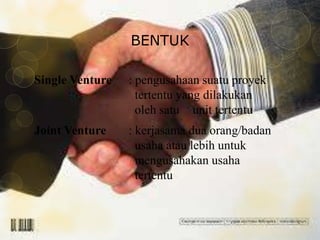 Dokumen ini menjelaskan tentang joint venture dan akuntansi yang terkait, termasuk perbedaan antara single venture dan joint venture. Akuntansi joint venture melibatkan pembukuan terpisah dan pengelolaan rekening untuk setiap anggota, dengan penghitungan laba/rugi yang spesifik. Selain itu, dokumen mencatat bahwa penyelenggaraan akuntansi yang tidak terpisah dapat menyebabkan masalah dalam perhitungan.
