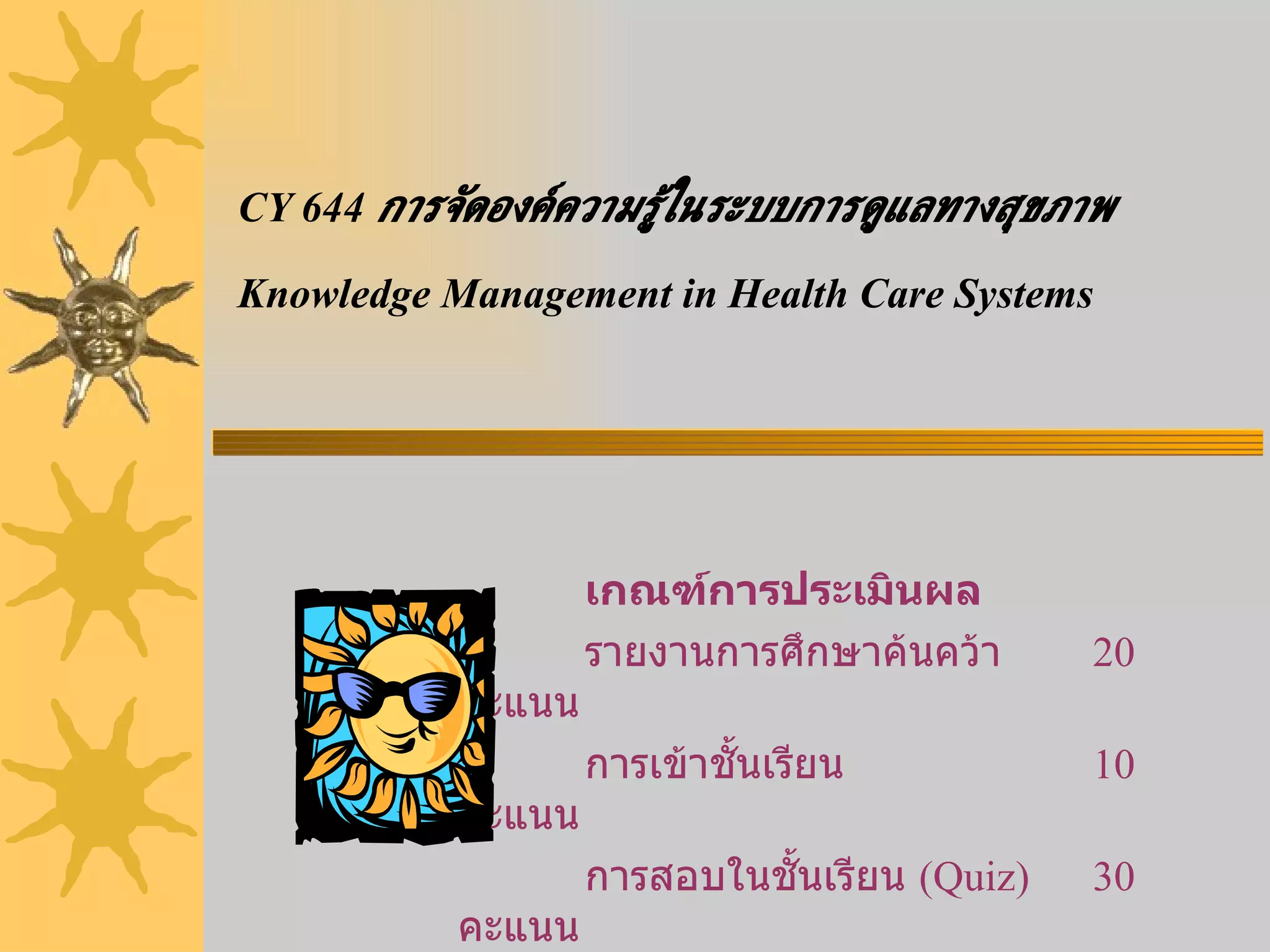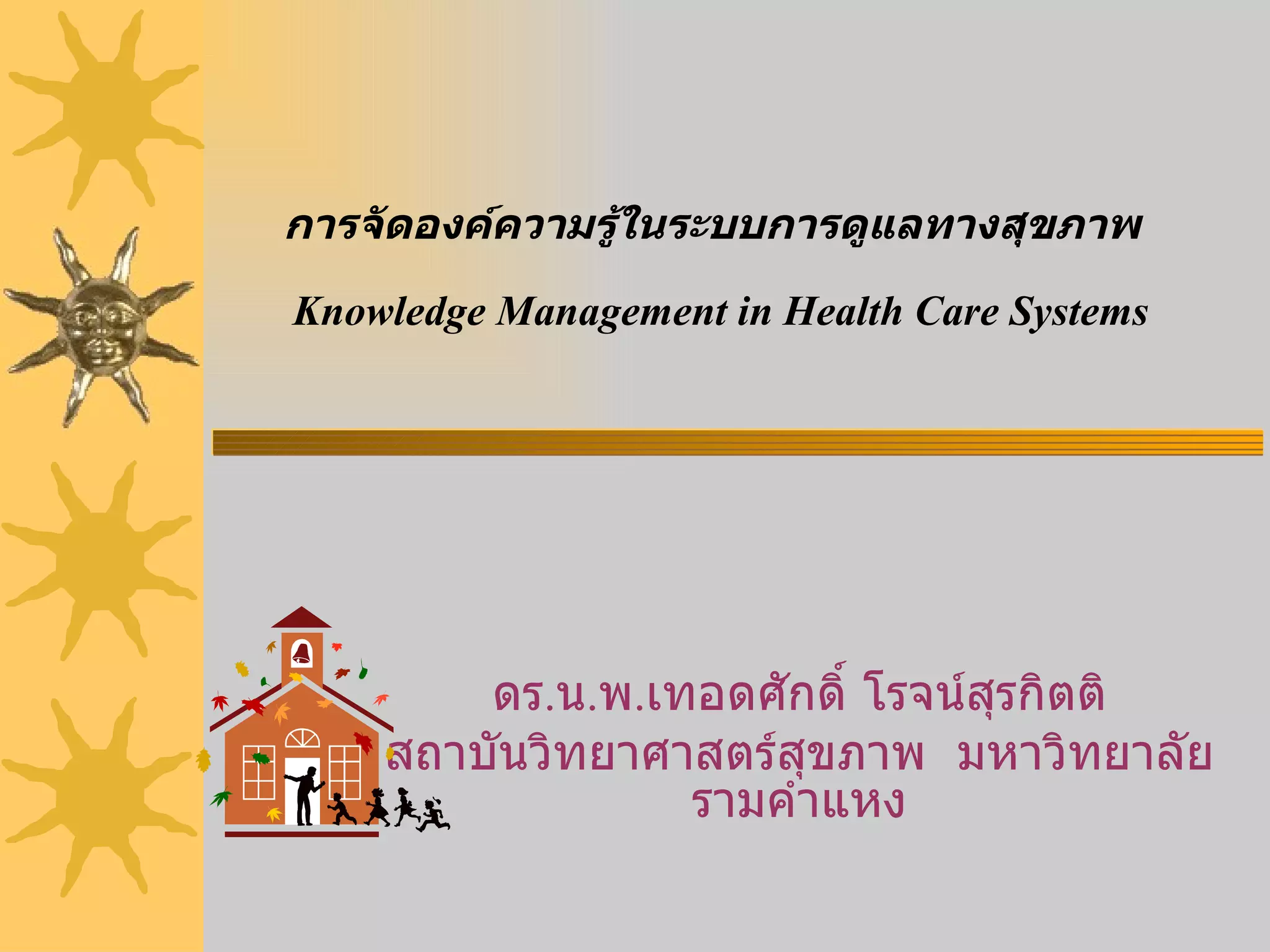 Knowledge Capture Technique 1. ดร . น . พ . เทอดศักดิ์ โรจน์สุรกิตติ สถาบันวิทยาศาสตร์สุขภาพ มหาวิทยาลัยรามคำแหง การจัดองค์ความรู้ในระบบการดูแลทางสุขภาพ Knowledge Management in Health Care Systems 2. เกณฑ์การประเมินผล รายงานการศึกษาค้นคว้า 20 คะแนน การเข้าชั้นเรียน 10 คะแนน การสอบในชั้นเรียน ( Quiz) 30 คะแนน การสอบไล่ 40 คะแนน CY 644 การจัดองค์ความรู้ในระบบการดูแลทางสุขภาพ Knowledge Management in Health Care Systems 3. Introduction to Knowledge Management Understanding Knowledge Capturing Tacit Knowledge Knowledge Capture Techniques KMSLC Knowledge Creation & Architecture Knowledge Codification Knowledge Transfer Data Mining Tools & Portals Who Owns It Knowledge Workers Case Study I Case Study II Course Outline 4. 5. 6. 7. เทคนิคสำหรับการจัดเก็บองค์ความรู้ Knowledge Capture Technique วิธีการสังเกตการณ์ ( Observation) การระดมสมอง ( Brainstorming) การวิเคราะห์อย่างเป็นลำดับขั้นตอน ( Protocol Analysis) การตัดสินใจ ( Decision Making) แผนภูมิมโนทัศน์ ( Concept Mapping) 8. 9. 10. 11. คุณสมบัติของผู้สังเกตที่ดี 1. ตั้งใจ มีสมาธิ และตื่นตัวเสมอ 2. มีประสาทสัมผัสที่รวดเร็ว และมีประสิทธิภาพ 3. จดบันทึกเหตุการณ์ได้รวดเร็ว ถูกต้อง 4. ไม่ลำเอียงในสิ่งที่สังเกต 5. มีความสามารถในการสรุปรวบยอดความคิด 6. มีพื้นฐานความรู้ในเรื่องที่จะสังเกต 12. 13. 14. ข้อดีของการเก็บข้อมูลโดยการสังเกต 1. ได้ข้อมูลปฐมภูมิ 2. ได้ข้อมูลในสถานการณ์จริง 3. ข้อมูลที่เป็นพฤติกรรมมักเป็นข้อมูลจริง 4. ไม่รบกวนผู้ถูกสังเกต 5. ข้อมูลที่ได้มีความคลาดเคลื่อน น้อย 15. ข้อด้อยการเก็บข้อมูลโดยการสังเกต 1. ลงทุนมากทั้งเงิน คน และเวลา 2. พฤติกรรมผู้ถูกสังเกตเปลี่ยน ไป จากปกติ 3. พฤติกรรมบางอย่างใช้การสังเกตไม่ได้ 4. ถ้าสังเกตหลายเรื่องพร้อมกัน อาจมีความคลาดเคลื่อน 16. การตรวจสอบคุณภาพแบบสังเกต 1. ความตรง : ตรวจสอบโดยผู้เชี่ยวชาญเพื่อดูความ ครอบคลุม ครบถ้วนของประเด็นที่จะสังเกต 2. ความเที่ยง : ดูความสอดคล้องของคำตอบได้ 17. 18. 19. 1. ใช้การระดมสมองเพื่อรวบรวมและขยายแนวคิดให้กว้างออกไป ไม่ใช่ใช้การะดมสมองเพื่อการหาแนวคิดใหม่ๆ Andrew Hargaden ได้แสดงให้เราเห็นว่าความคิดสร้างสรรค์เกิดขึ้นเมื่อ คนเราคิดเพิ่มเติมจากความคิดตั้งต้นที่มียู่แล้ว อานุภาพของการระดมสมองเกิดขึ้นจากการที่เราได้สร้างสถานที่ที่ปลอดภัยเพื่อให้ผู้คนมาแบ่งปันแสดงความคิดที่แตกต่างหลากหลายออกมา แต่ถ้าคุณทำการระดมสมองเพื่อหวังจะเก็บเอาความคิดสร้างสรรค์โดยไม่มีแนวคิดตั้งต้นอยู่ก่อนเลยการระดมสมองแบบนั้นจะเป็นการเสียเวลาที่สุด ( ใช้กล่องรับความคิดเห็นก็เพียงพอแล้ว ) 2. อย่าได้ตกใจถ้าพนักงานของคุณอยู่ในภาวะหวาดกลัวในการระดมสมอง บางครั้งคนก็กลัวที่จะแสดงความคิดเห็นอะไรที่เขาคิดว่าความคิดนั้นอาจจะเป็นความคิดโง่ๆ โดยเฉพาะถ้าบริษัทของคุณไล่พนักงานออกปีละ 10% ถ้าคุณทำให้พนักงานห