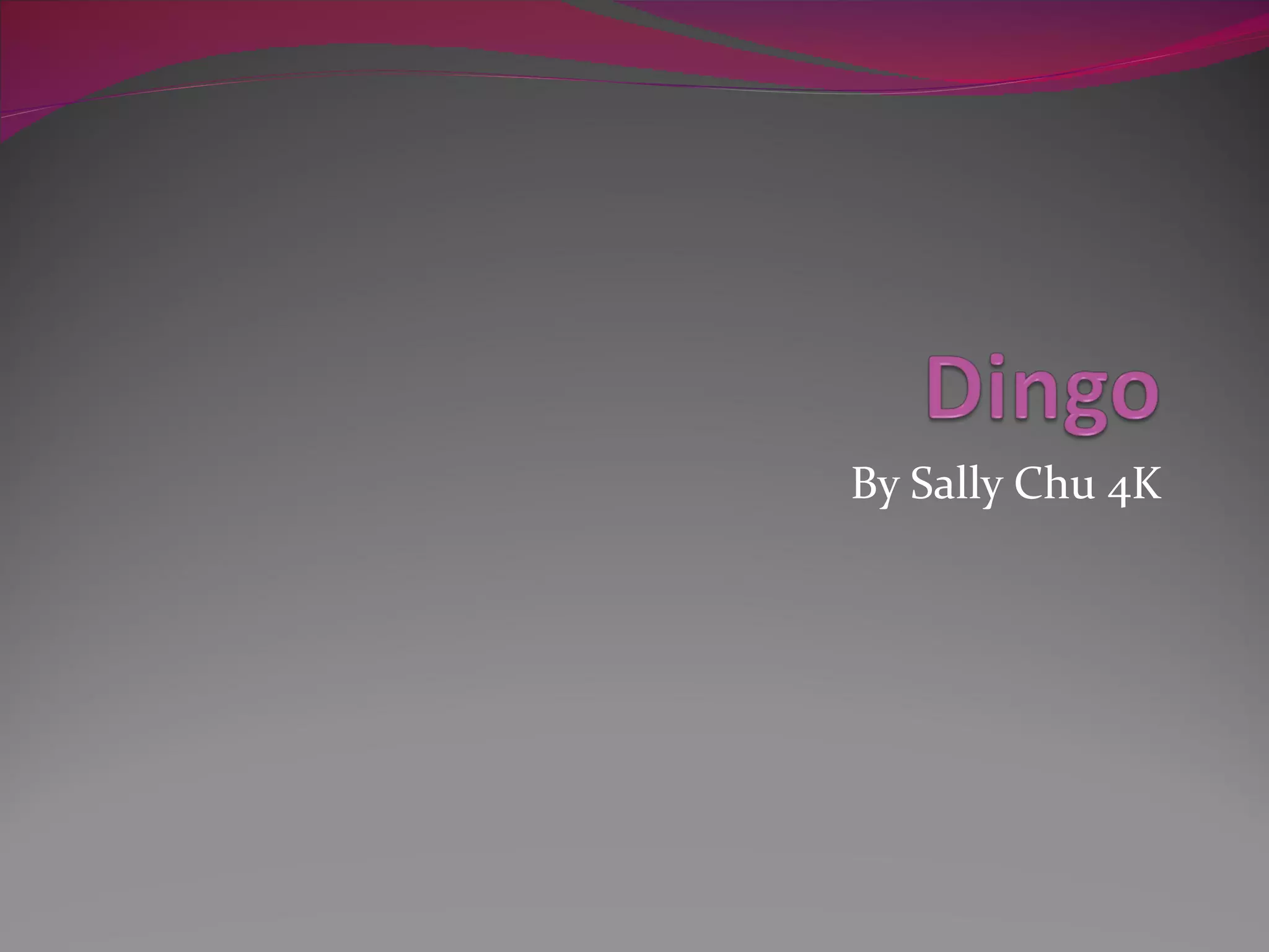 Description The dingois a wild dog. Is a medium sized dog,has a bushy tail and a red and yellow coat. They don’t bark they howl.