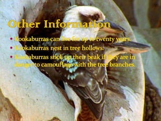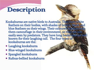 The document summarizes information about several different animals. It provides descriptions, habitats, diets, behaviors, and other details about dingos, quokkas, emus, echidnas, sulphur crested cockatoos, and fairy penguins that live in Australia.
