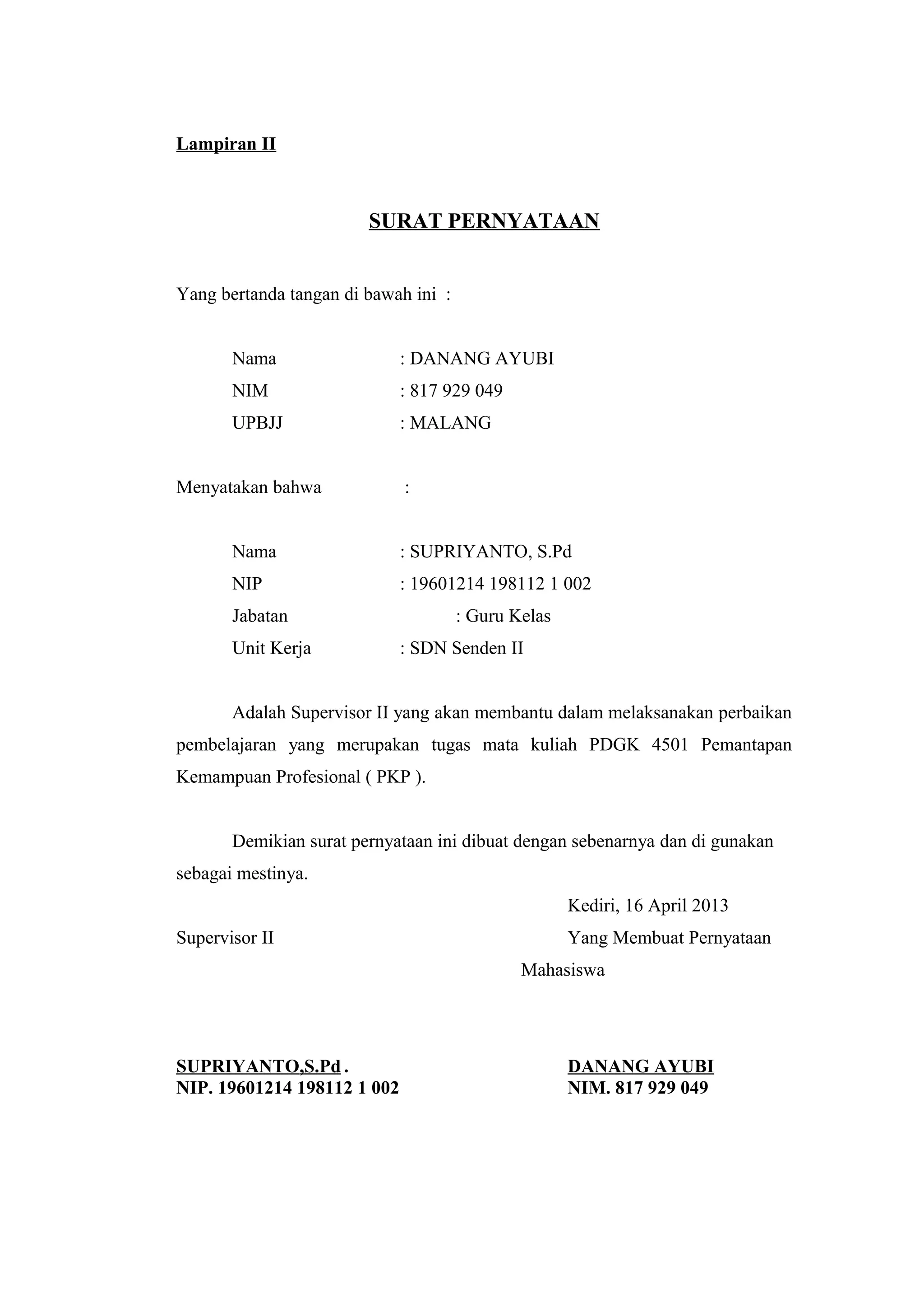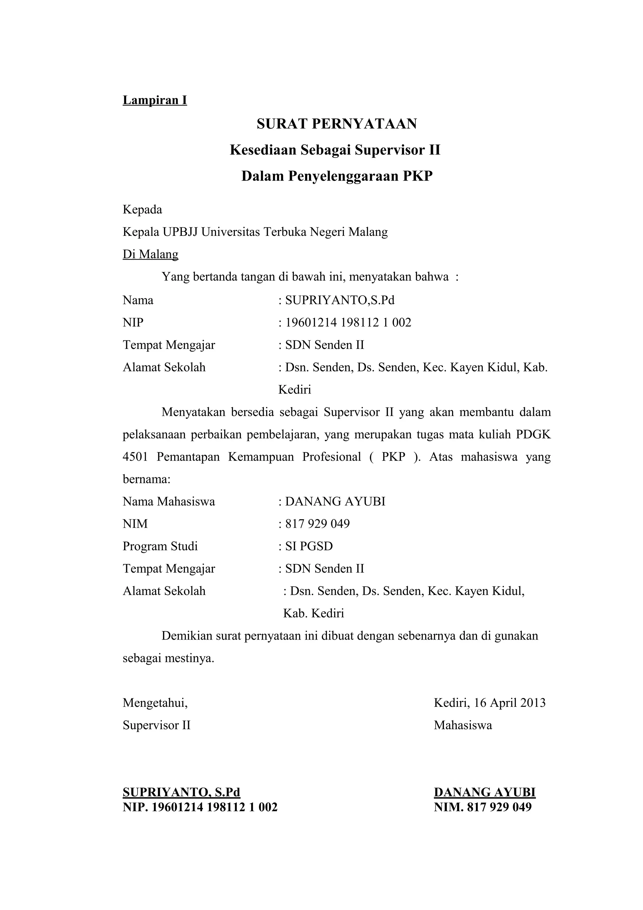 1. Surat pernyataan kesediaan Supriyanto sebagai supervisor untuk mahasiswa bernama Danang Ayubi dalam melaksanakan PKP di SDN Senden II;