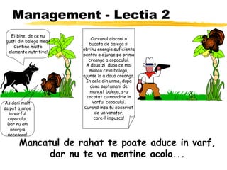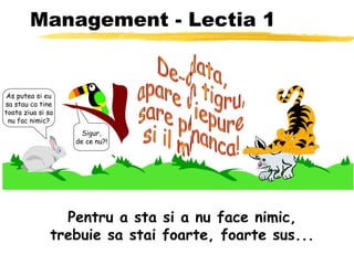 Documentul oferă lecții umoristice de management prin analogii cu natura, evidențiind importanța acțiunii și a responsabilității. Se subliniază că, deși anularea eforturilor poate duce uneori la succes temporar, este esențial să fii activ pentru a menține poziția dorită. Lecțiile sunt ilustrate prin exemple precum un curcan care devine imatur prin consum de balegă și o pasăre care este salvată și apoi devorată dintr-o situație nefericită.