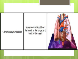 The document discusses the circulatory system and its major components. It explains that the circulatory system transports oxygen, nutrients, and wastes throughout the body. The three major parts of the circulatory system are the heart, blood, and blood vessels. The heart pumps blood through the blood vessels to circulate nutrients and oxygen to cells and tissues, and to remove wastes. Blood vessels include arteries, veins, and capillaries that carry blood throughout the body.