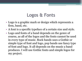 The document analyzes logos and fonts used by bands, noting that logos represent a band and fonts specify typeface. It states that rock bands tend to use gothic or simple fonts and logos to match their genre, while pop bands use fancier styles. The document provides examples of the Iron Maiden and Creed bands' logos, describing how Iron Maiden's metal-inspired logo sells merchandise and how Creed's simple modern font fits their name's meaning of faith.